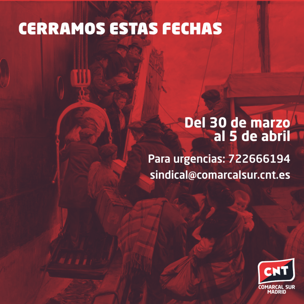 Entre el próximo lunes 30 de marzo y domingo 5 de abril, incluidos, el Sindicato permanecerá cerrado en materia de asesorías sindicales y jurídicas; además de permanencias.