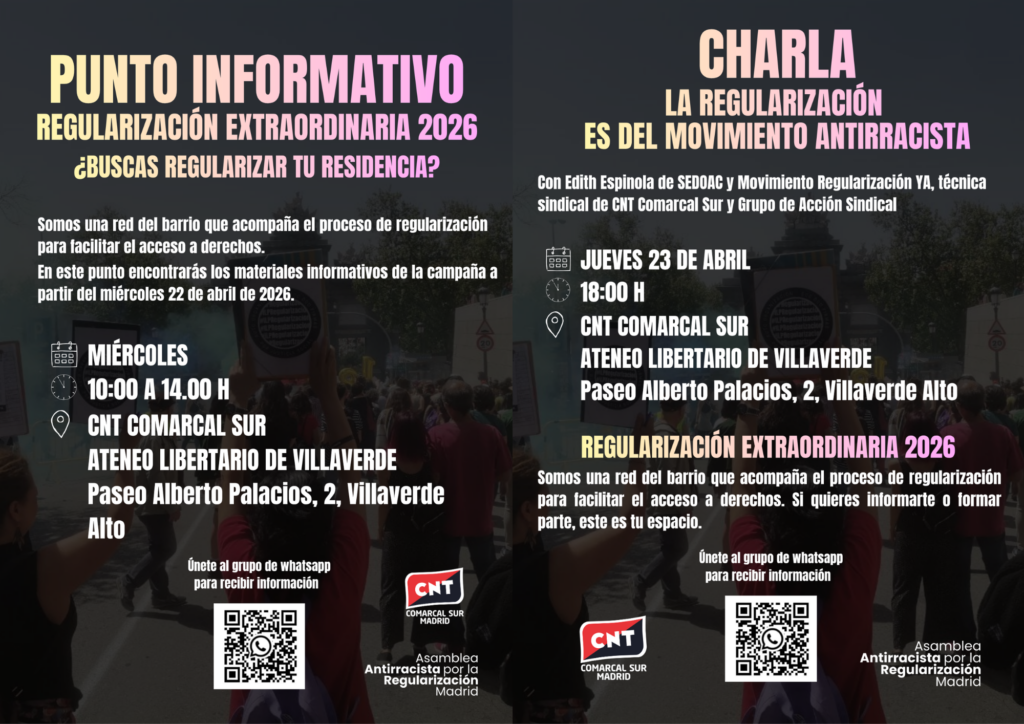 A partir del próximo 22 de abril, los miércoles de 10:00 a 14:00, el Ateneo Libertario de Villaverde abrirá sus puertas como punto informativo para la regularización extraordinaria 2026, en Paseo Alberto Palacios 2.